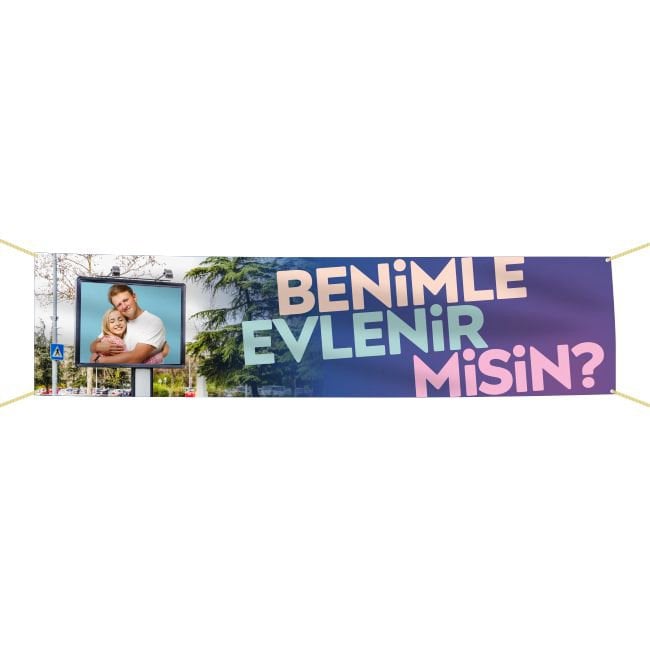Kişiye Özel Resimli Benimle Evlenir misin? Kumaş Pankart Özel Tasarımlı Pankart 75x300 cm ebatlarındadır. Parlak Saten kumaştan yapılmaktadır. Kenarları kopcalıdır. FL202209